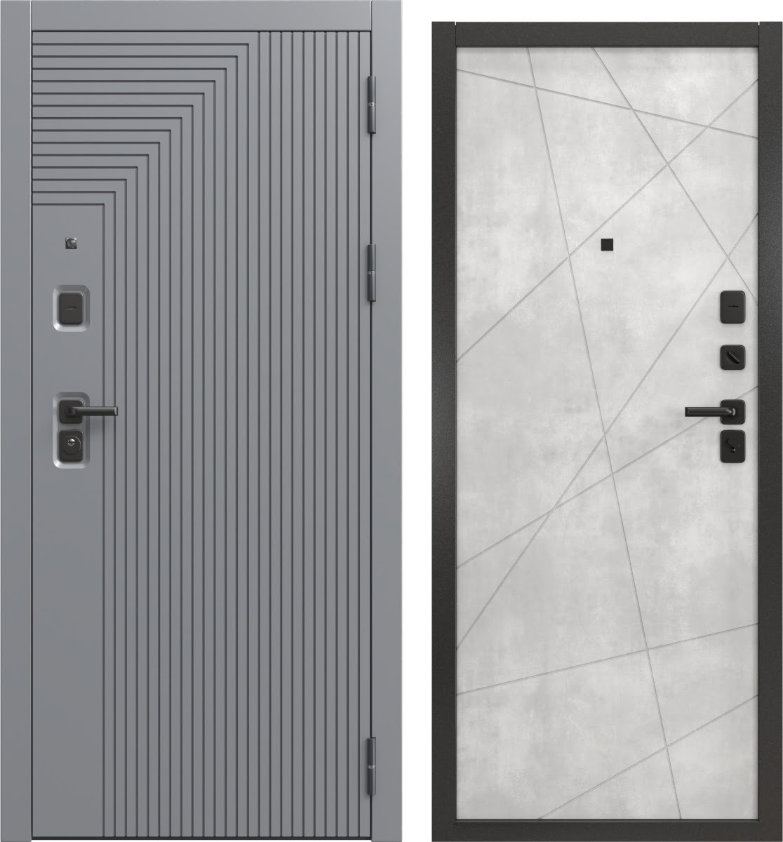 Входная металлическая дверь с внешним покрытием из фрезерованной МДФ-панели в цвете «Шагрень графит мягкая», с Г-образным наличником и внутренним покрытием из фрезерованной МДФ-панели в цвете «Бетон светлый». Покраска металла: муар черный.
