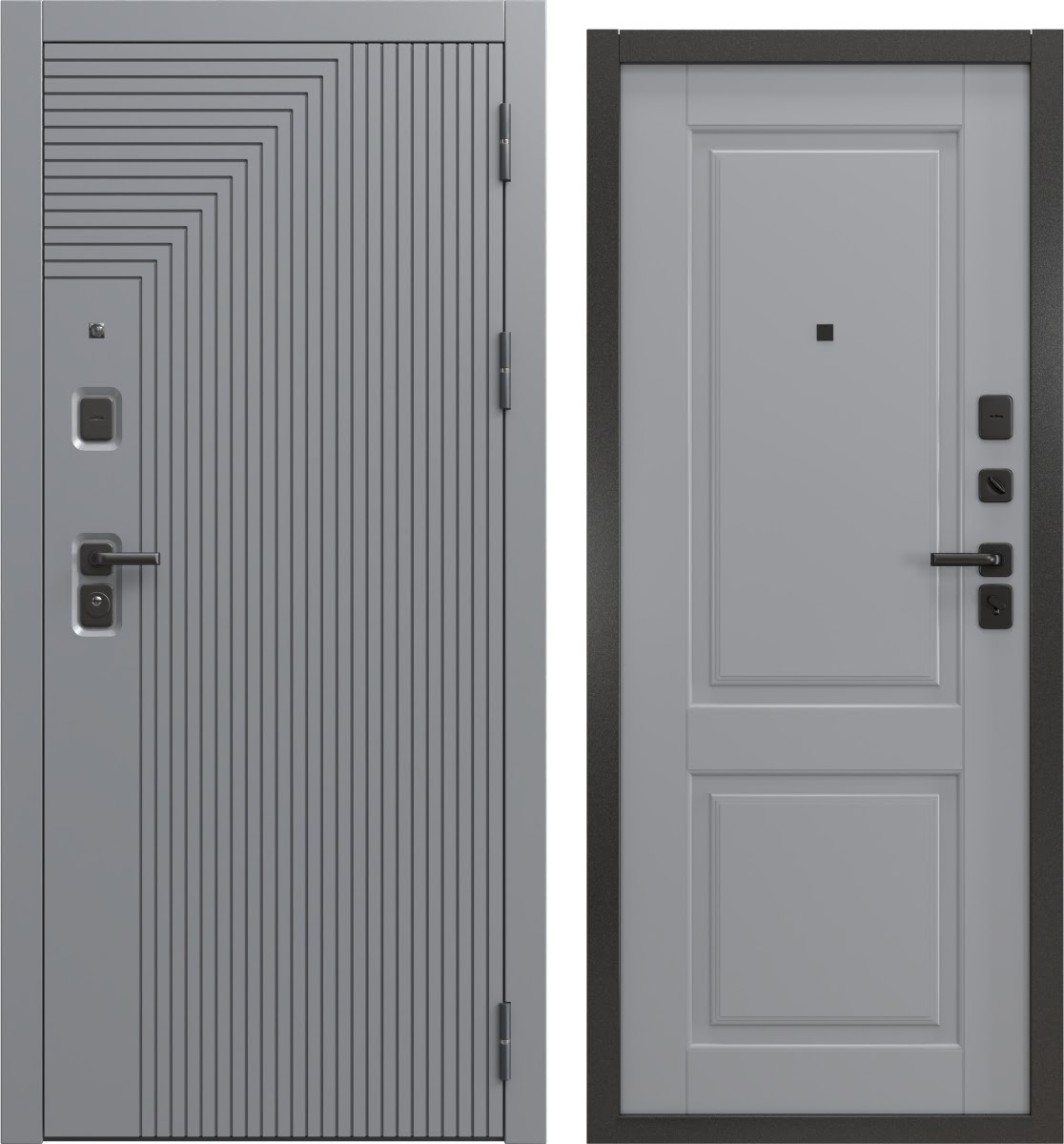 Входная металлическая дверь с внешним покрытием из фрезерованной МДФ-панели в цвете «Шагрень графит мягкая», с Г-образным наличником и внутренним покрытием из фрезерованной МДФ-панели в цвете «Шагрень серая мягкая». Покраска металла: муар черный.