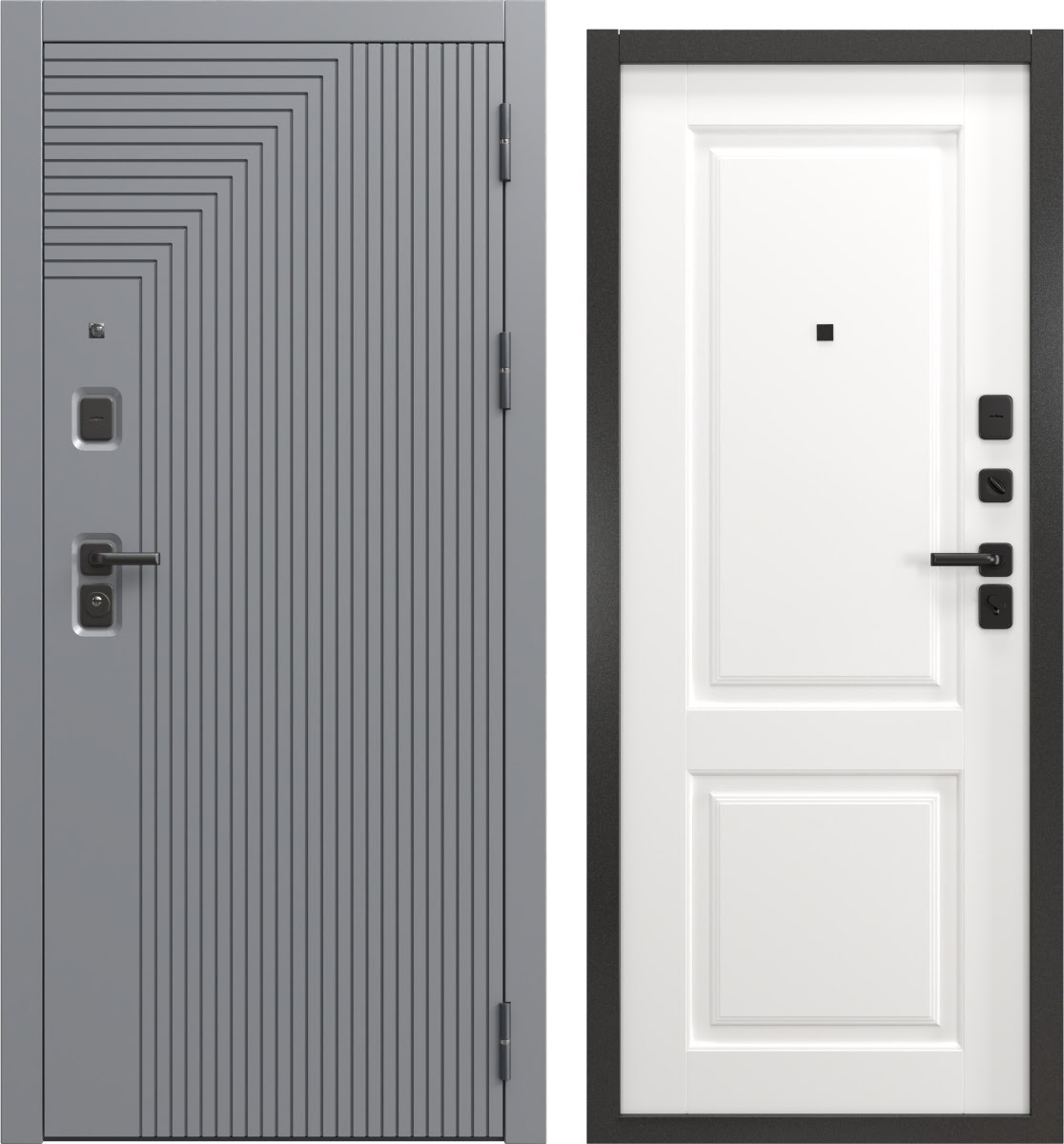 Входная металлическая дверь с внешним покрытием из фрезерованной МДФ-панели в цвете «Шагрень графит мягкая», с Г-образным наличником и внутренним покрытием из фрезерованной МДФ-панели в цвете «Шагрень белая мягкая». Покраска металла: муар черный.