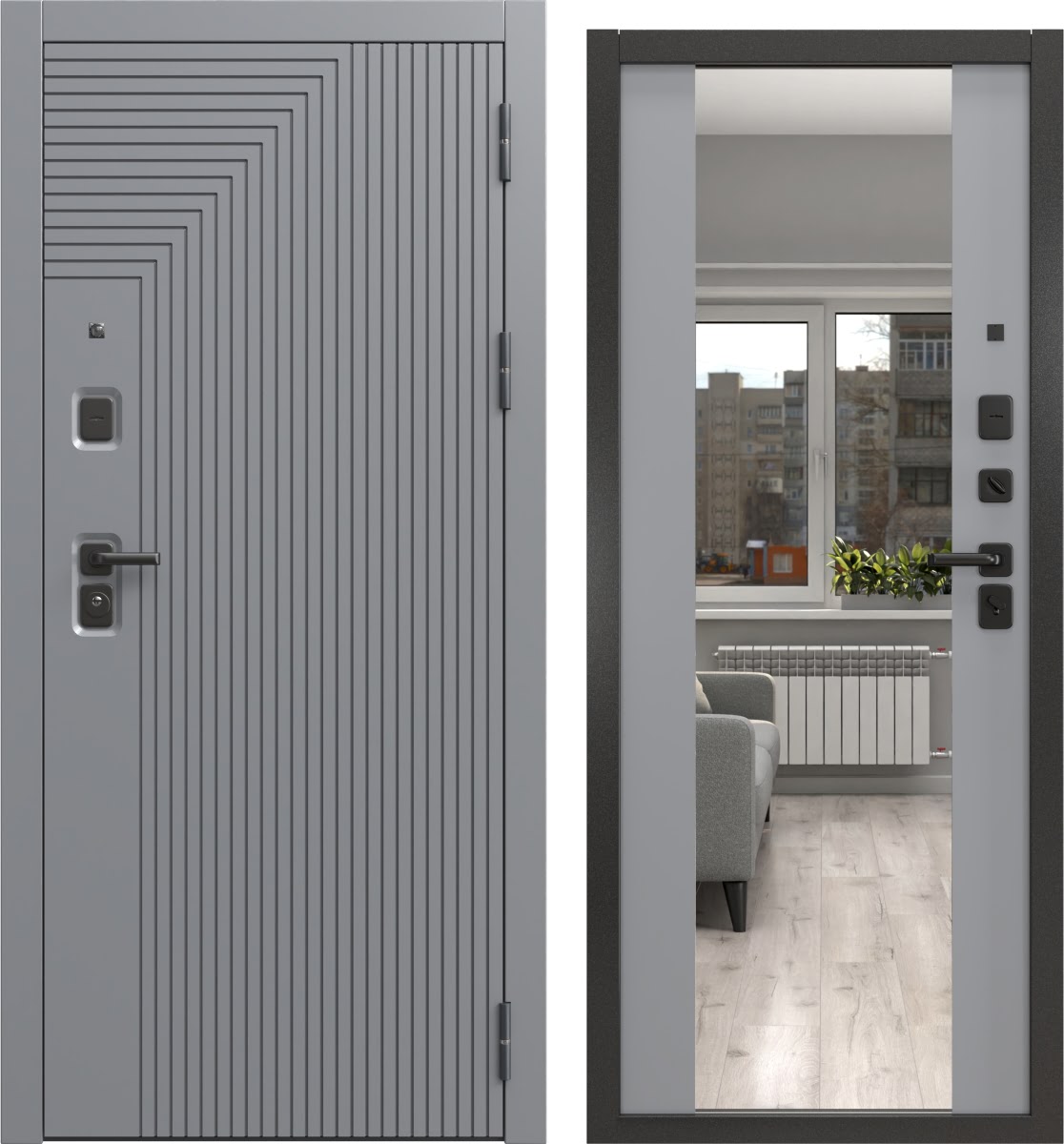 Входная металлическая дверь с внешним покрытием из фрезерованной МДФ-панели в цвете «Шагрень графит мягкая», с Г-образным наличником и внутренним покрытием из МДФ-панели в цвете «Шагрень серая мягкая», с зеркалом. Покраска металла: муар черный.