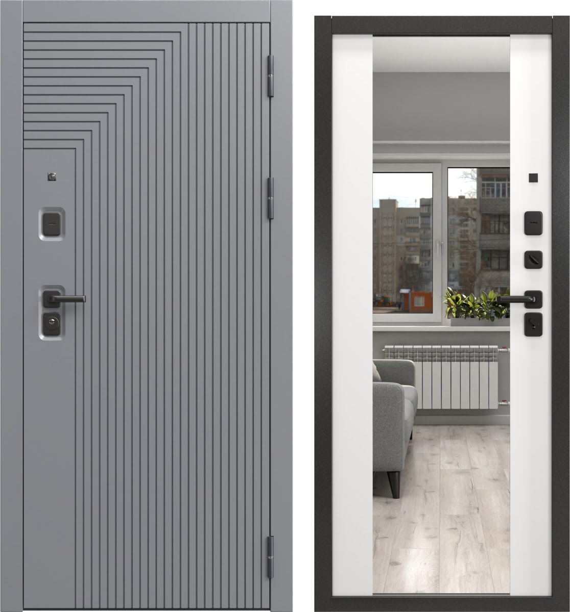 Входная металлическая дверь с внешним покрытием из фрезерованной МДФ-панели в цвете «Шагрень графит мягкая», с Г-образным наличником и внутренним покрытием из МДФ-панели в цвете «Шагрень белая мягкая», с зеркалом. Покраска металла: муар черный.