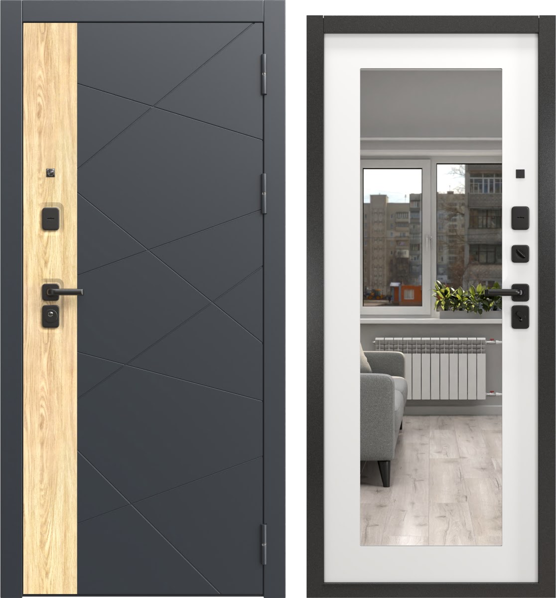 Входная металлическая дверь с внешним покрытием из фрезерованной МДФ-панели в цвете «Шагрень черная / Дуб янтарь», с Г-образным наличником и внутренним покрытием из фрезерованной МДФ-панели в цвете «Шагрень белая мягкая», с зеркалом.